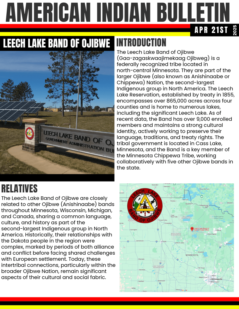 The Leech Lake Band of Ojibwe (Gaa-zagaskwaajimekaag Ojibweg) is a federally recognized tribe located in north-central Minnesota. They are part of the larger Ojibwe (also known as Anishinaabe or Chippewa) Nation, the second-largest Indigenous group in North America.