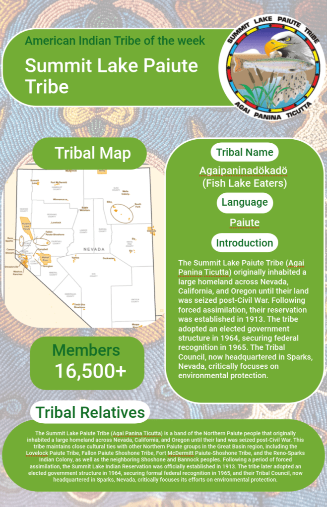 - Description: Provides broad historical and cultural context on the larger Northern Paiute Nation, of which the Summit Lake Paiute Tribe is a band (traditionally the Agai Panina Ticutta).