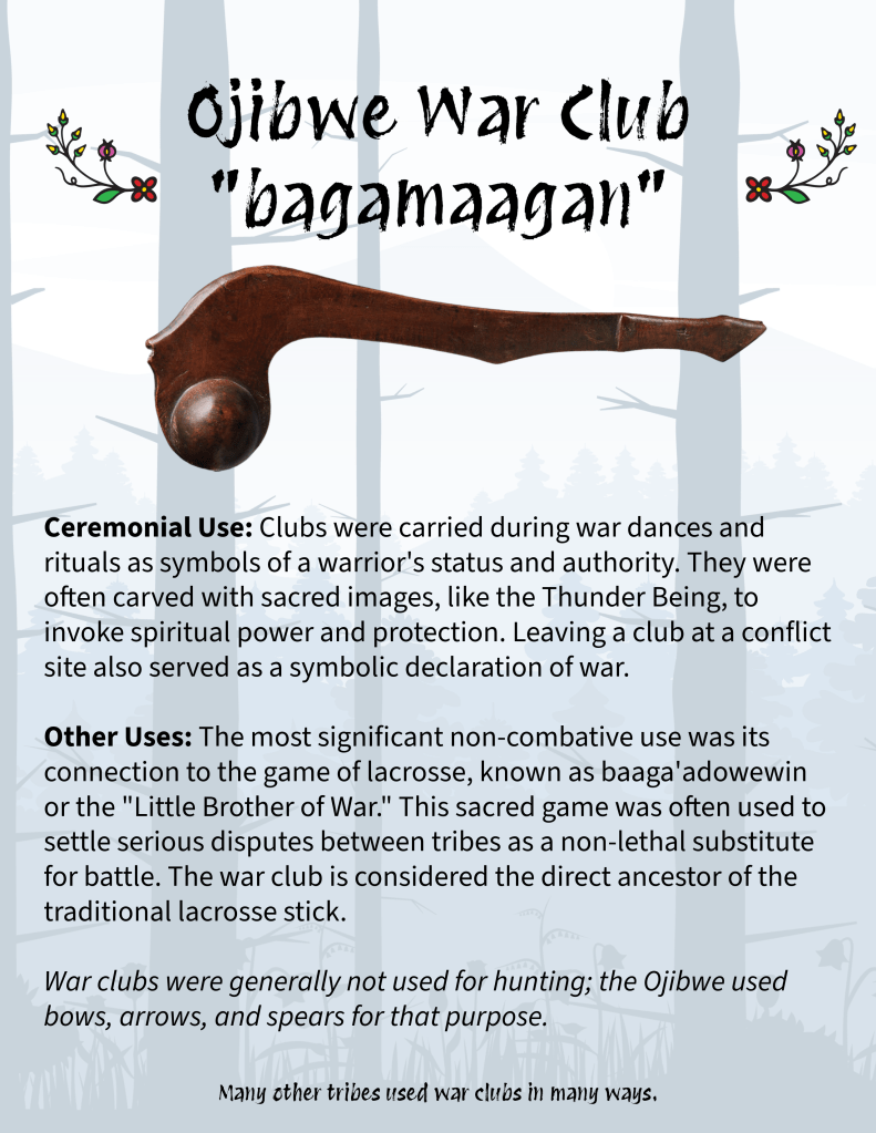 War clubs were generally not used for hunting; the Ojibwe used bows, arrows, and spears for that purpose.